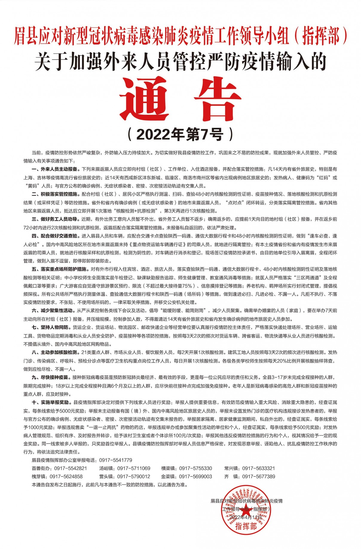 眉县应对新型冠状病毒感染肺炎疫情防控工作领导小组(指挥部)关于加强外来人员管控严防疫情输入的通告(2022年第7号)
